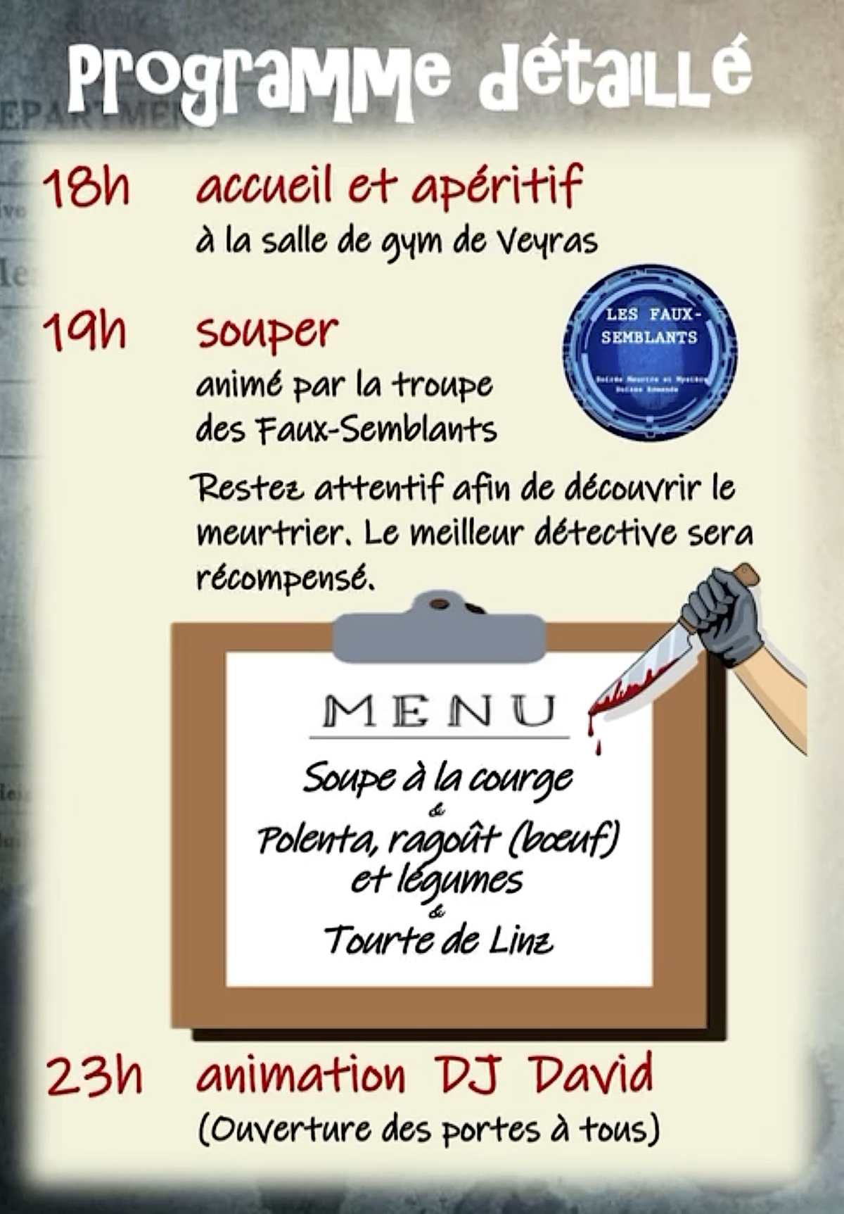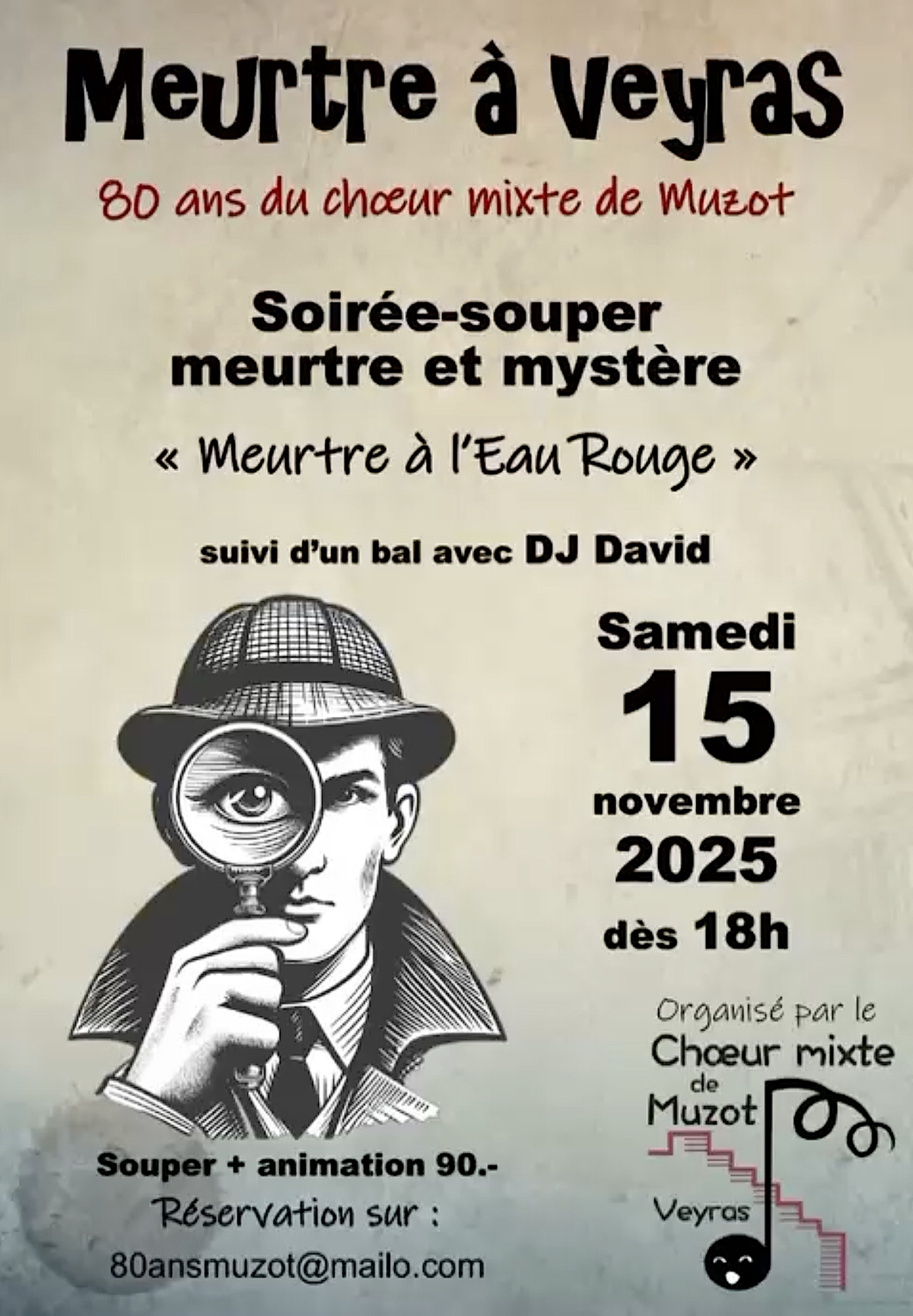 Culture et loisirsAgenda des manifestationsSoirée-souper meurtre et mystère du Choeur mixte de Muzot